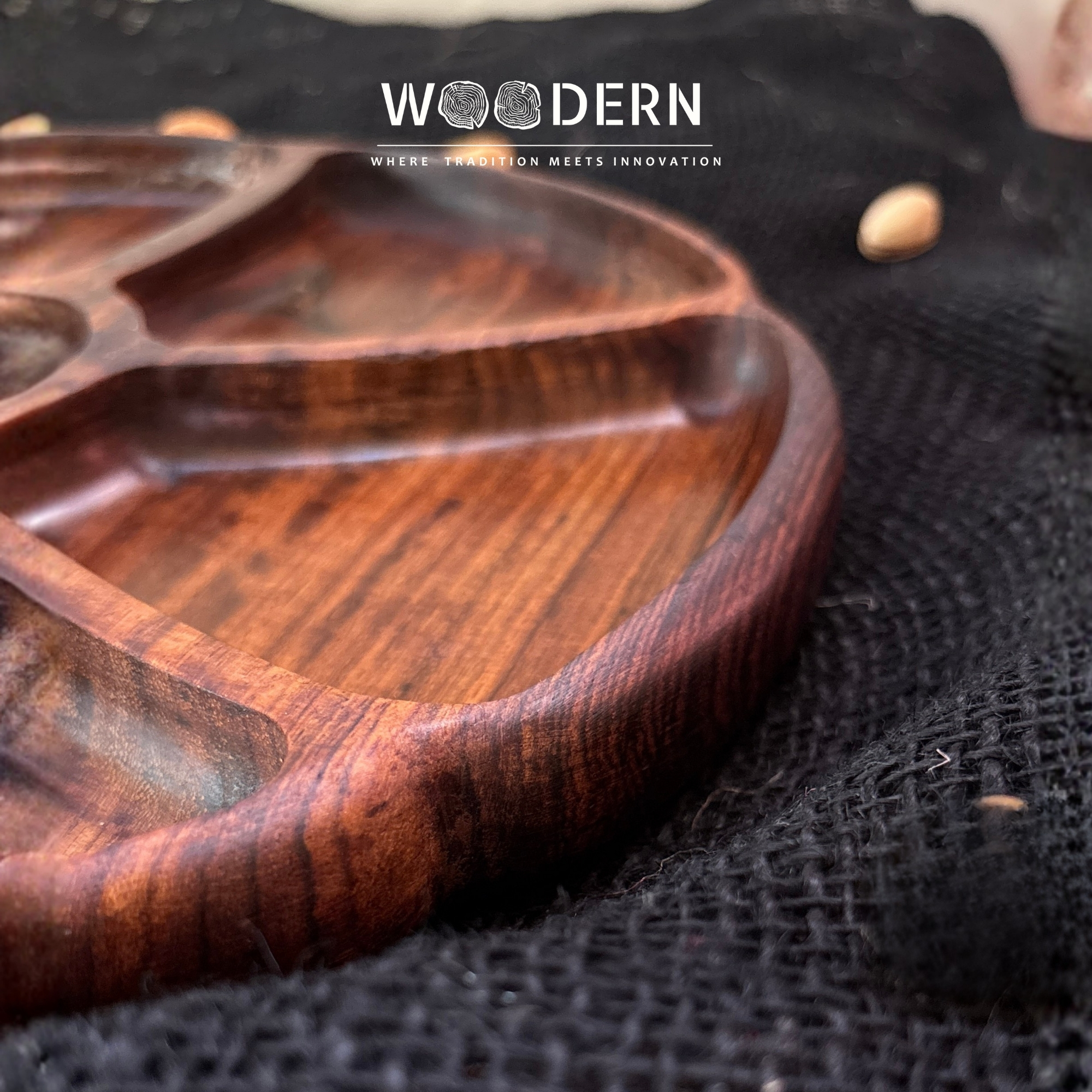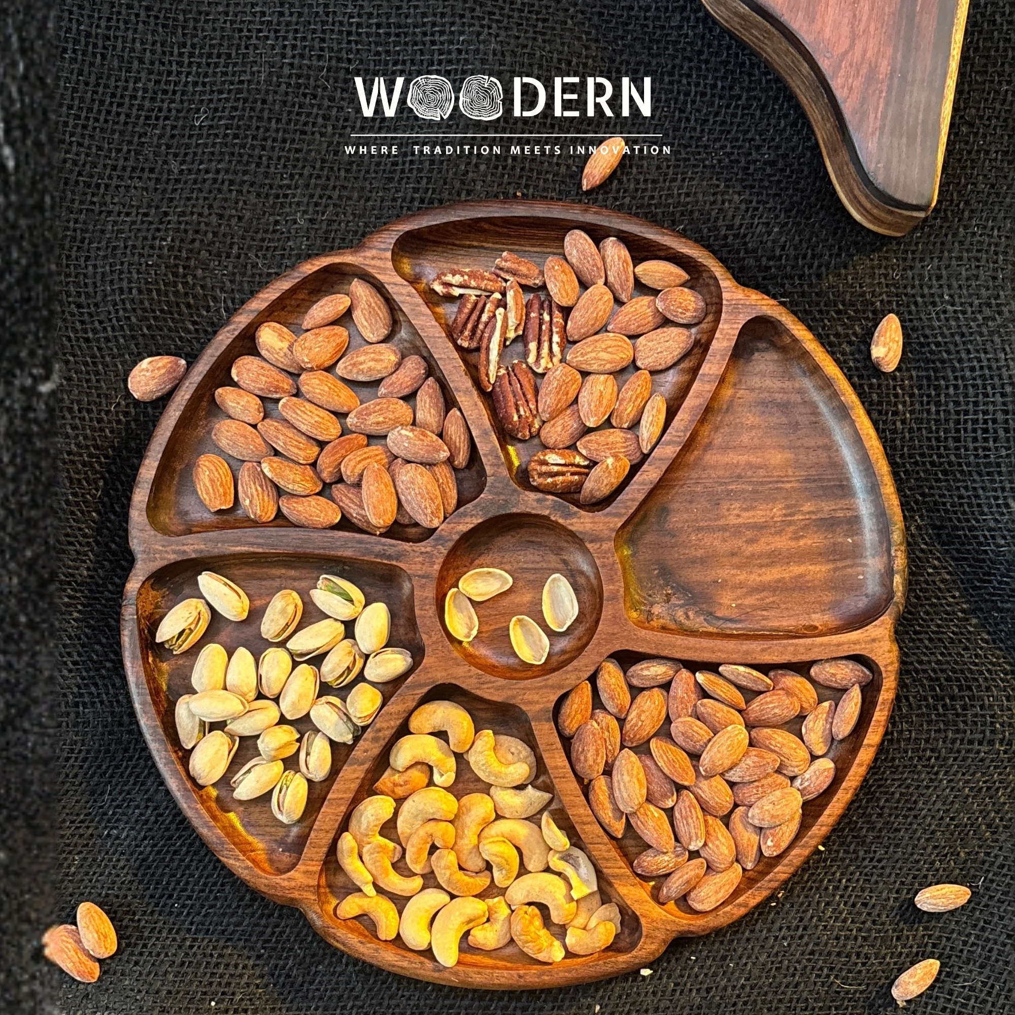 Beautifully handcrafted from 100% natural Sheesham wood, this round tray is designed with seven neatly divided sections, perfect for serving a mix of nuts, dried fruits, or snacks in an organized and stylish way.